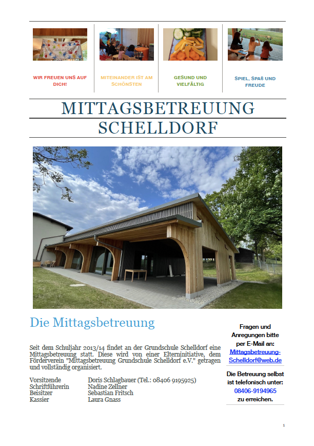 Seit dem Schuljahr 2013/14 findet an der Grundschule Schelldorf eine Mittagsbetreuung statt. Diese wird von einer Elterninitiative, dem Förderverein "Mittagsbetreuung Grundschule